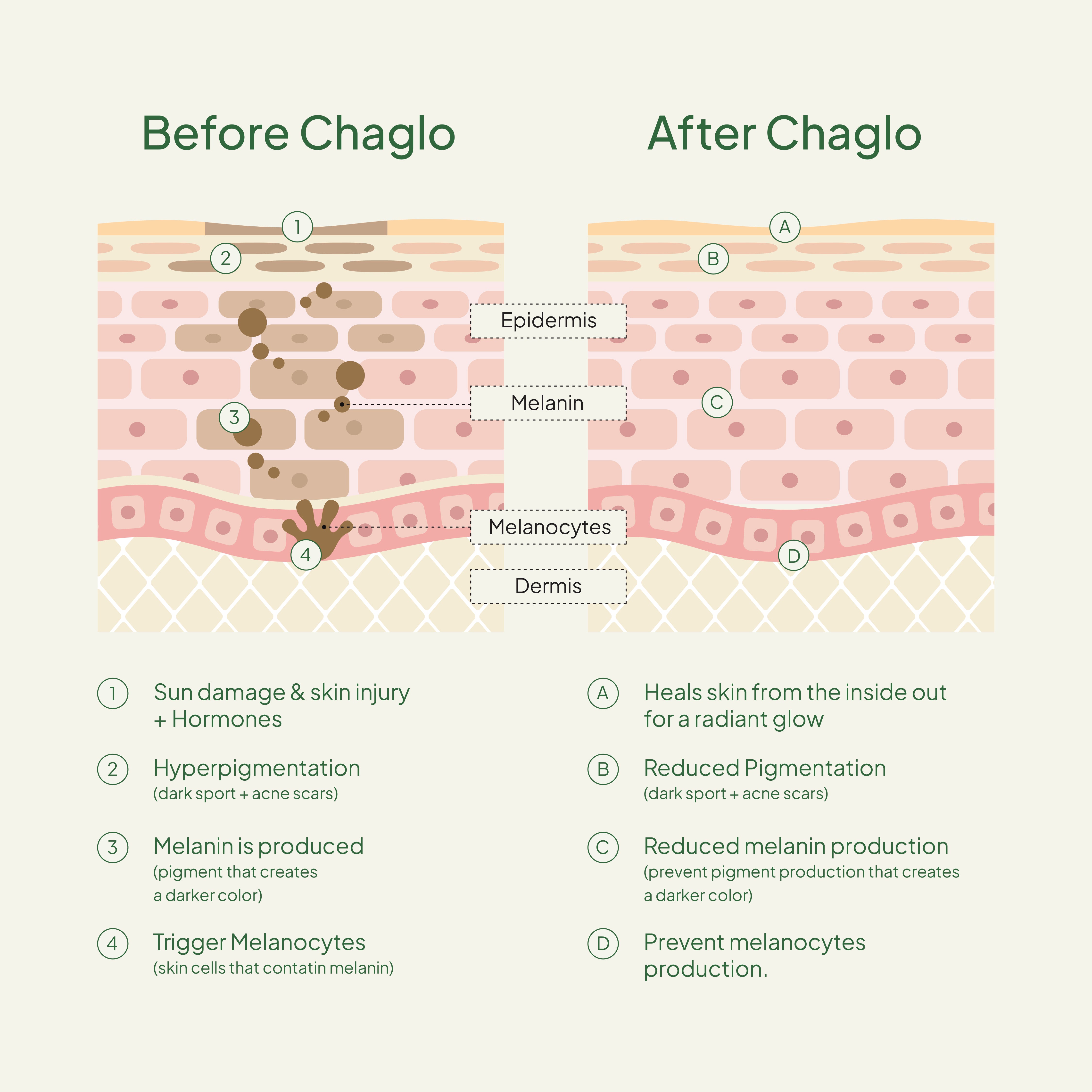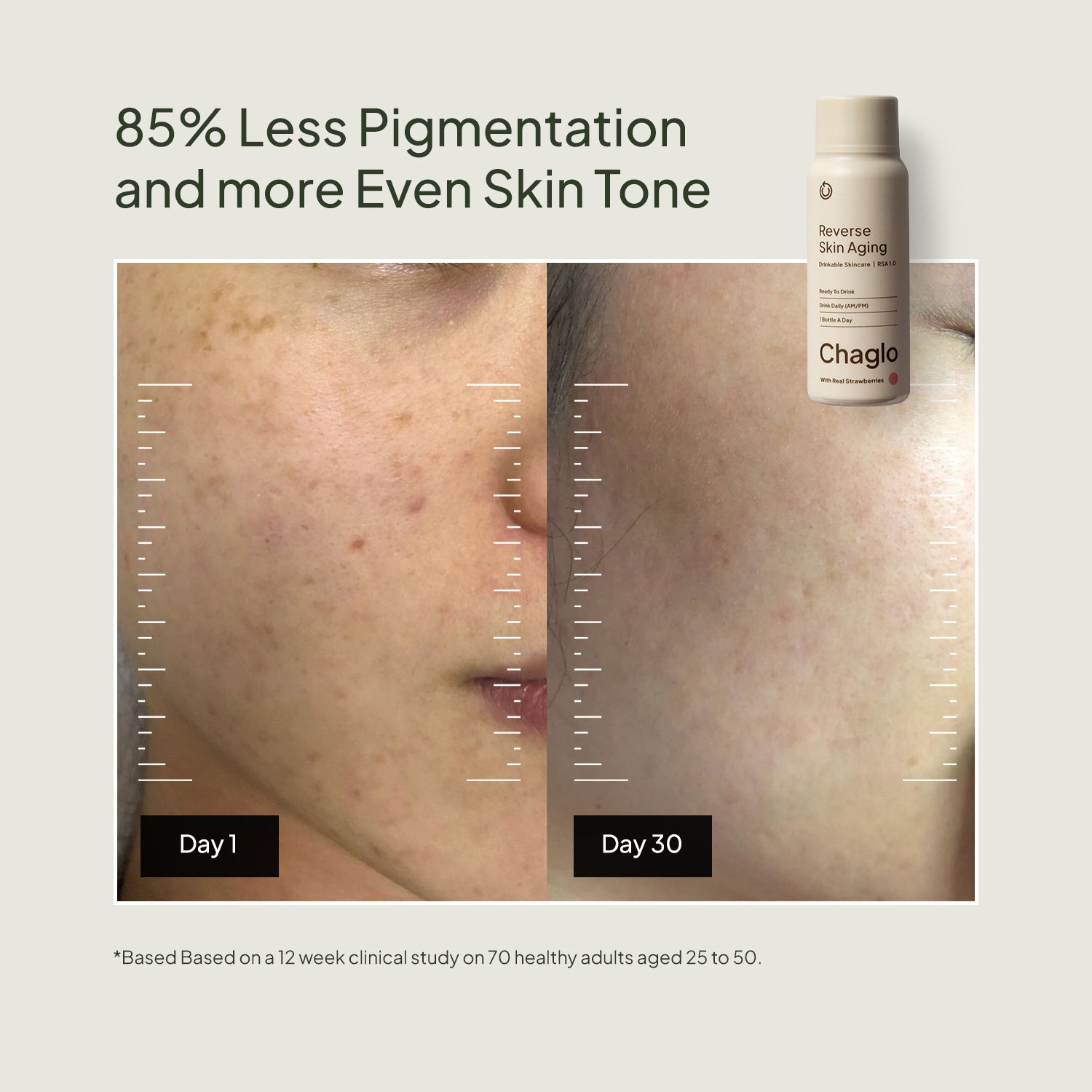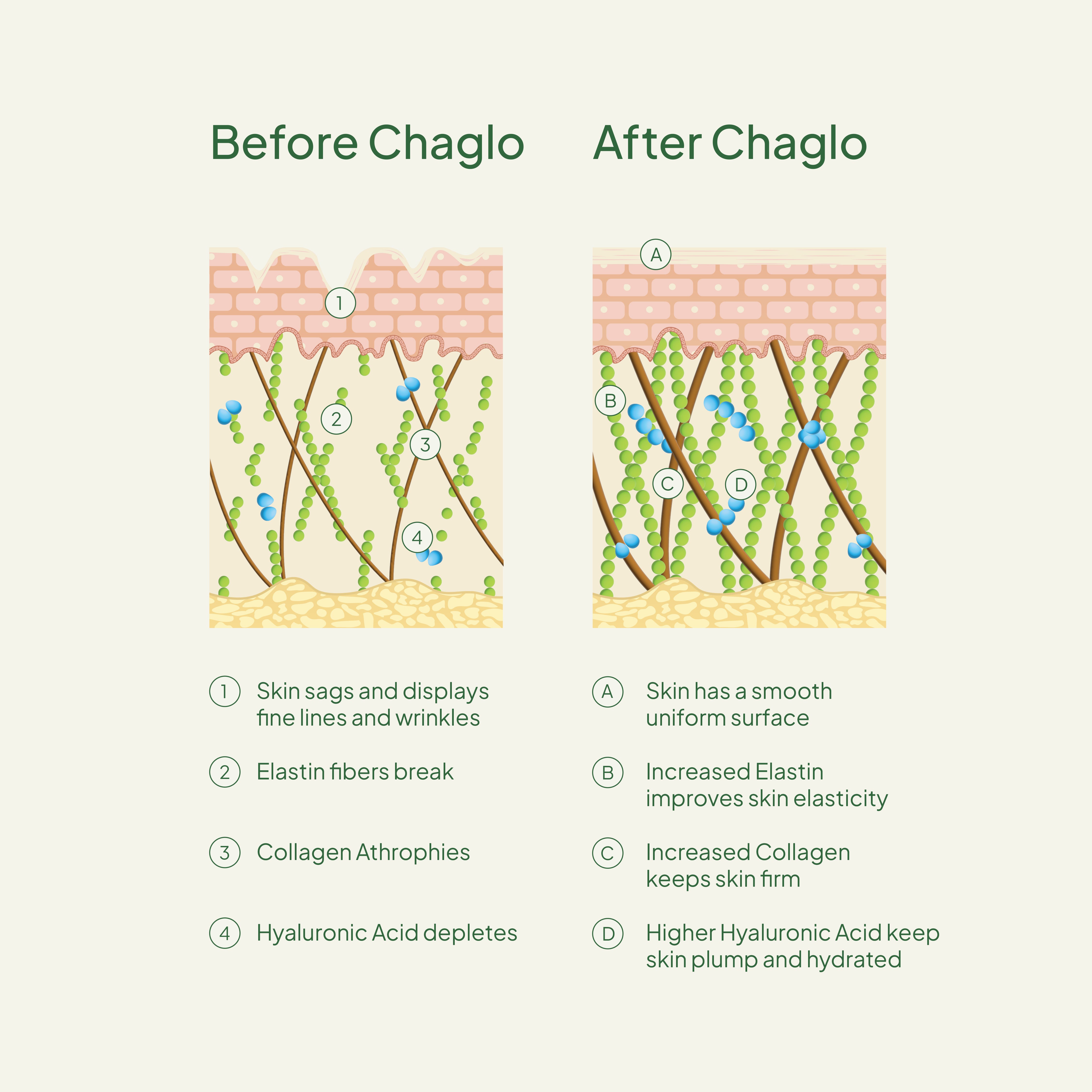 Chaglo is a premium daily drinkable supplement designed to slow and even reverse visible signs of skin aging - Giving you glass like glowing skin in 3 weeks. Unlike regular collagen, it is: